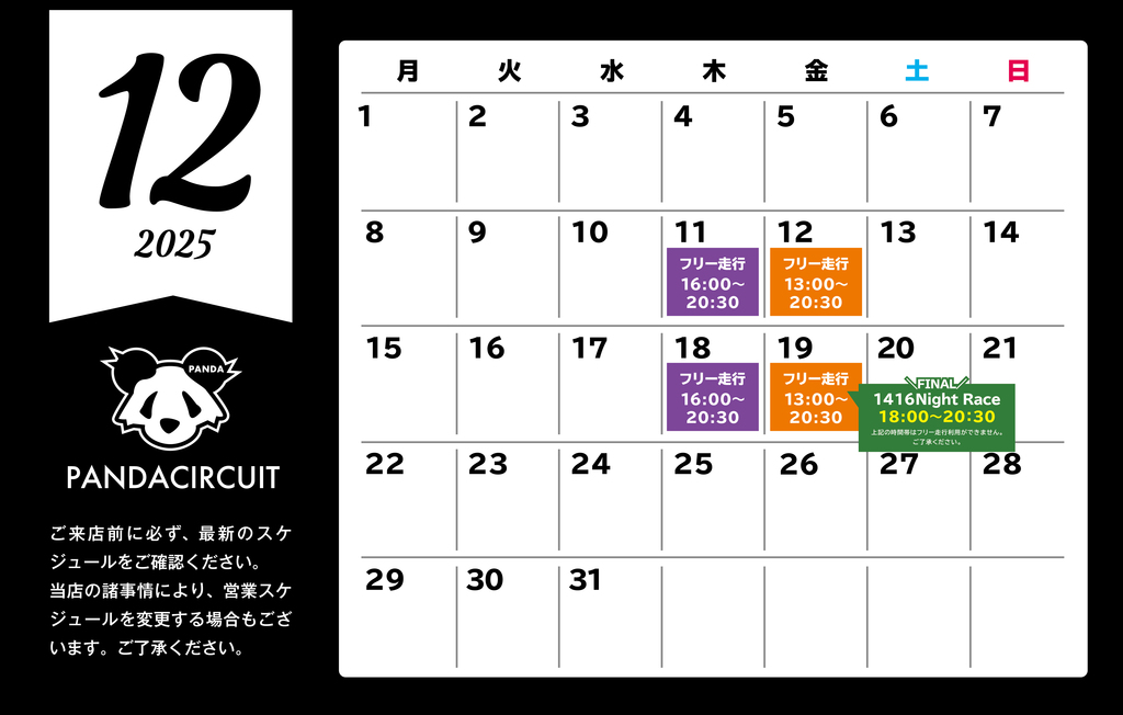 2025年12月パンダサーキットの営業スケジュールになります。