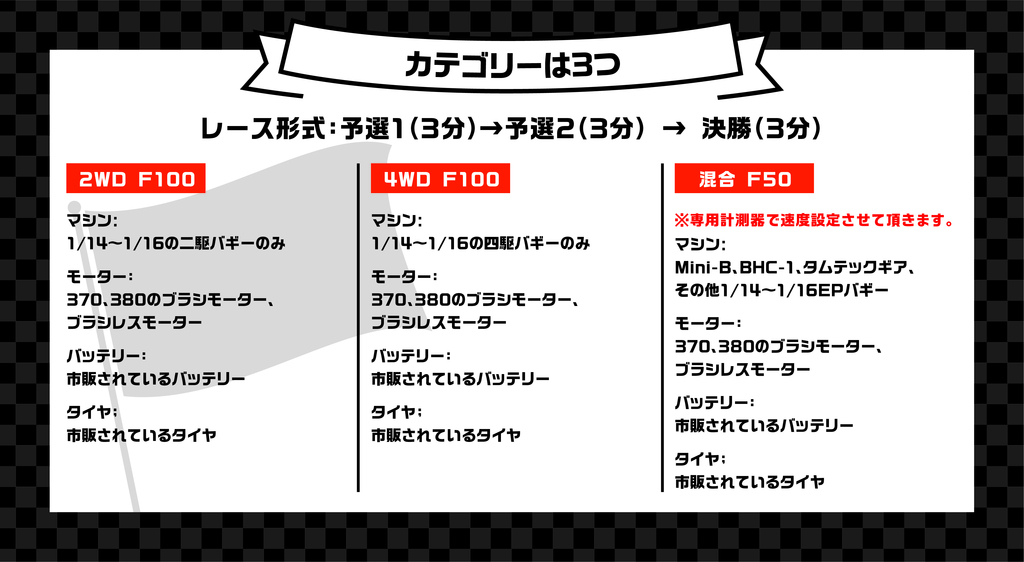 今年からカテゴリーが2WDF100、4WDF100、混合F50の三つになります。